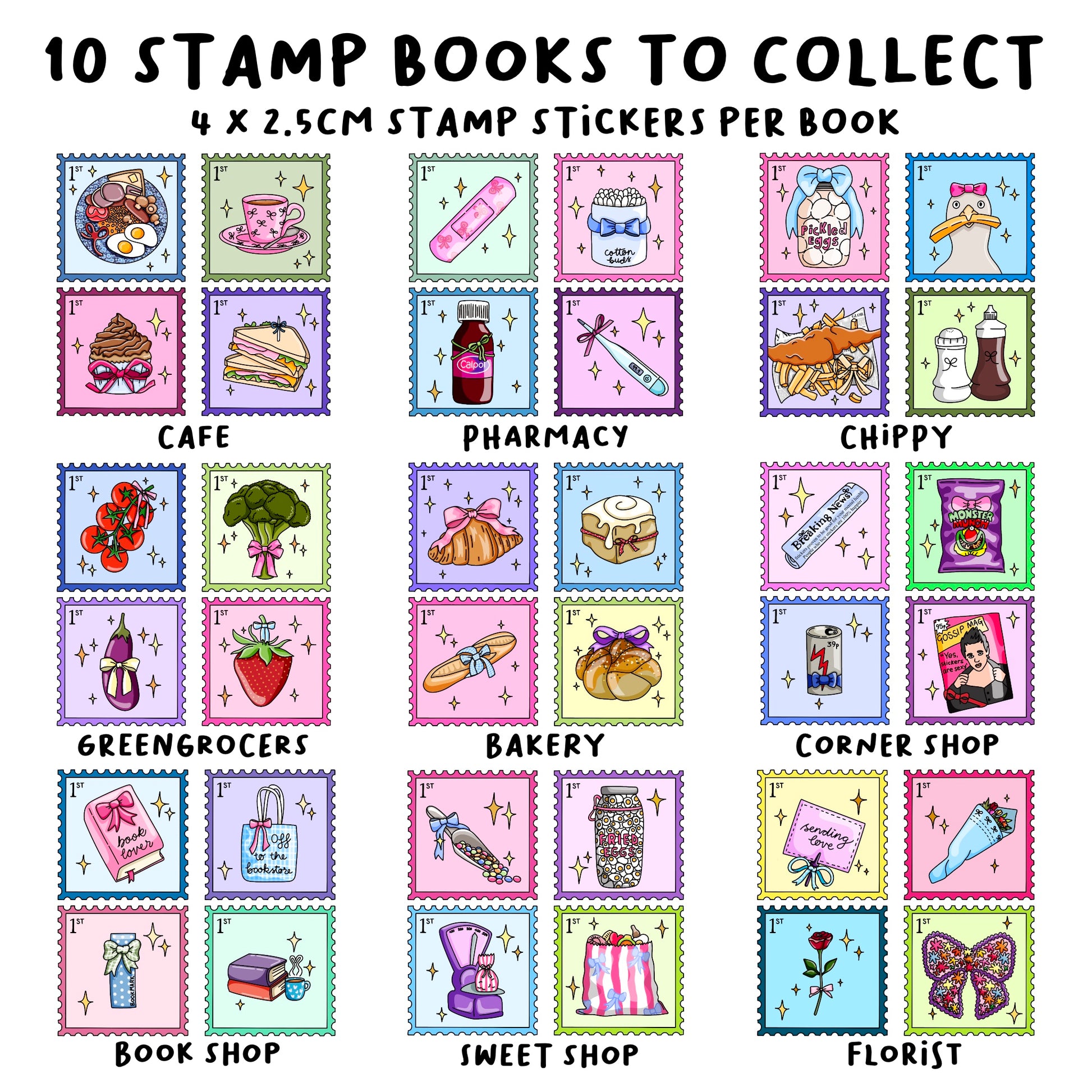 Each ‘book of stamps’ contains 4 hand drawn stamp stickers measuring 2.5cm each with stamp book packaging. There are 10 designs to collect overall and each book is dispensed from my stamp vending machine at random. This series is based on shops you’ll find on the uk high street.